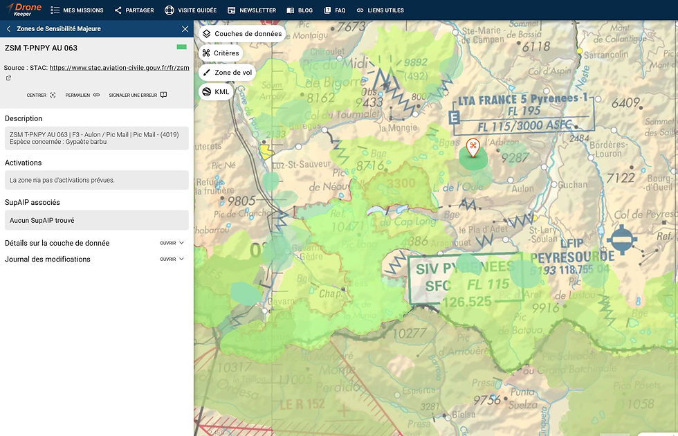 Attention, ces zones n'apparaissent pas sur le calque UAS de Géoportail/Cartes.gouv . Il convient donc de se les afficher en plus pour savoir si l'on se trouve dans une telle zone ou non. Cependant, les outils de préparation de vol (DroneKeeper, DroneSpot, et FlyBy par exemple) les affichent par défaut :